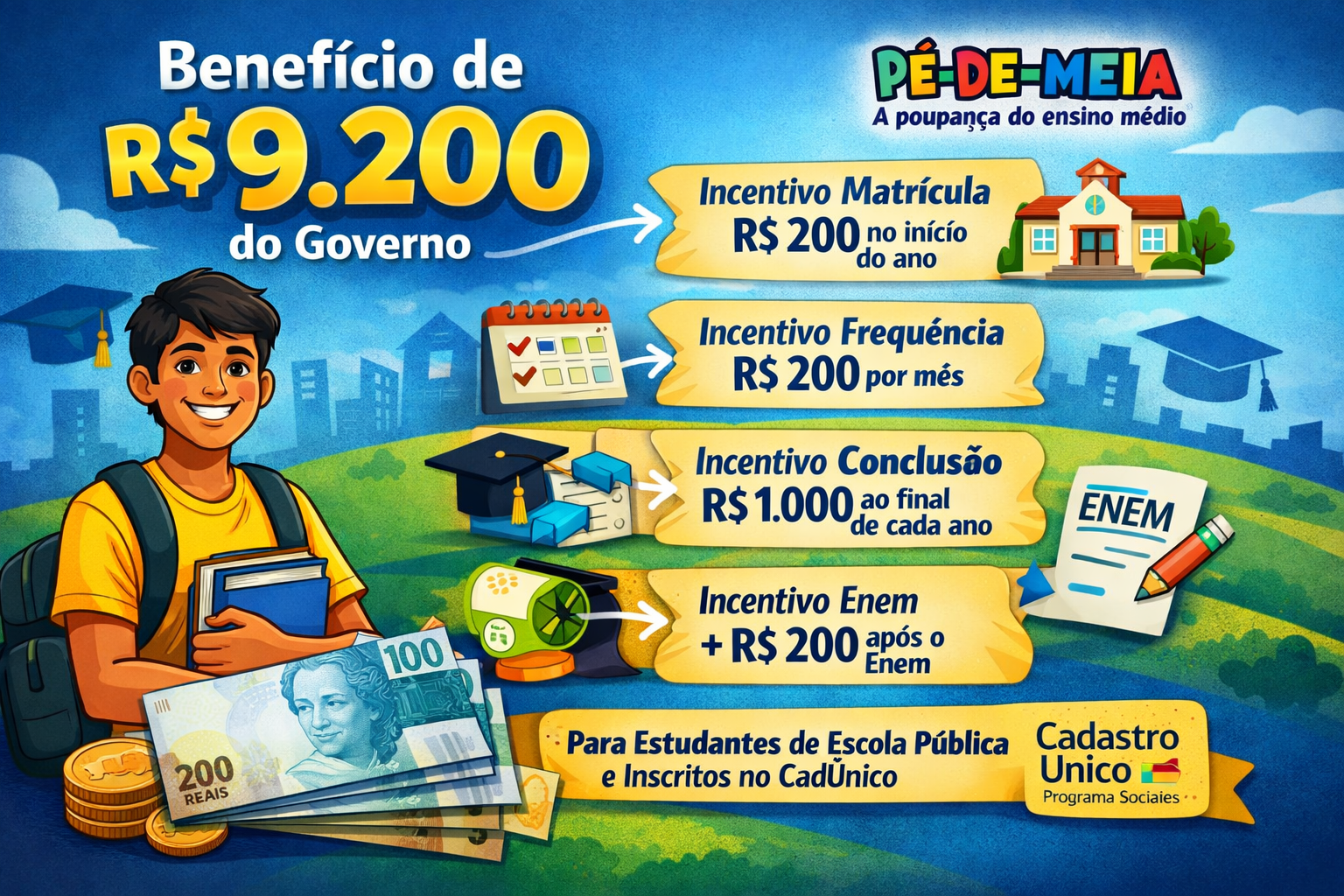 Diferentemente de benefícios assistenciais tradicionais, o Pé-de-Meia não paga um valor fixo mensal único. O total de até R$ 9.200 é resultado da soma de diferentes incentivos distribuídos ao longo dos três anos do ensino médio. Essa estrutura foi desenhada para acompanhar o estudante durante toda a trajetória escolar.
